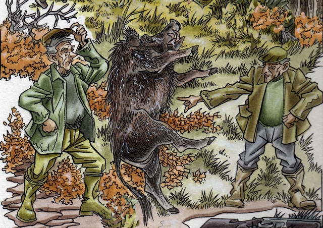 Sur plusieurs centaines de mètres, l’équipe progresse rapidement, presque en ligne droite, des traces sanglantes confirmant le bon travail du chien. Puis, la première difficulté se présente : un énorme saule dont les racines sont hors de l’eau, sous lesquelles décampe une compagnie de bêtes noires. Il y avait, d’après Jean-Pierre, trois belles laies et une dizaine de bêtes rousses. Duck, perturbé par ce remue-ménage, fouille consciencieusement les bauges. N’y trouvant pas l’odeur qu’il suivait depuis le départ, il quêta aux alentours pour retrouver le passage de l’animal blessé. Quelques minutes plus tard, après une exploration méthodique, le chien repart, entraînant dans son sillage le conducteur et les deux accompagnateurs. La voie s’enfonce maintenant dans une végétation plus dense, composée d’épines, de rejets et de branches cassées. Le chien tire sur la longe, sentant devant lui l’objet de la recherche. Une bauge, sous une grosse branche cassée, avec une belle tache de sang frais, indique que le sanglier vient de quitter les lieux. Bernard prend la décision de lâcher le chien. Invitant ses collègues à le rejoindre, il arrête Duck et le libère de la botte. Immédiatement, le teckel disparaît. « Attendons un peu », dit Bernard. Tous trois, attentifs au moindre bruit, entendent soudain, à quelques dizaines de mètres, le chien qui se récrie, et cela ne bouge pas de place. « Il est au ferme ! » lance Bernard. « Restez bien derrière moi... ». Les trois compères s’enfoncent dans la « jungle » vers l’endroit d’où provient la voix de Duck, aux prises avec le sanglier. Mais dans ce décor fourré, leur avancée n’est pas silencieuse. Parvenus à une dizaine de mètres, avant d’avoir vu quoi que ce soit, la bête noire lève le ferme et s’enfuit, poursuivie par le chien. La menée, au fur et à mesure qu’elle s’éloigne, devient de moins en moins perceptible. Nos trois chasseurs décident alors d’avancer dans la direction de fuite, attendant le retour du chien de rouge. La matinée passe ainsi, longue et inquiétante. Vers midi, Claude, le tireur, s’excuse de devoir les quitter et prend congé : son travail l’attend. Jean-Pierre, lui, invite Bernard à attendre sur place, le temps d’aller au village chercher de quoi se restaurer.