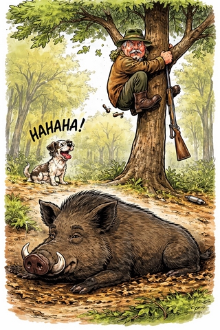 Les après-midi étaient donc l’occasion rêvée pour quelques exercices d’observation, ou pour se faire remarquer par la gent animale. Étienne, ancien de la marine, adorait raconter ses exploits : traversées épiques de la rade de Brest (toujours sur le port), captures de requins imaginaires, et sangliers terrassés par ses soins… le tout agrémenté de détails tellement précis qu’ils en devenaient fantasmagoriques. Il appela Drisse, sa petite chienne bâtarde au flair inégalé, mais à la motivation variable. Drisse, descendante d’un croisement improbable entre un chien de vache et un Beagle, sembla réfléchir trois bonnes minutes, avant de se décider à quitter le poêle. « Allez, Drisse, on y va ! » s’exclama Étienne. La chienne fit un tour sur elle-même et, comme pour protester contre l’absurdité de la mission, s’éloigna… de trois mètres à peine. Après quelques négociations musclées à base de friandises et de voix suppliantes, ils prirent enfin le chemin des épines noires, fusil en main et deux cartouches de 21 grains en poche. En bordure d’un épais buisson, Étienne aperçut une motte de terre fraîchement retournée. « Trop tôt pour des taupes… » murmura-t-il, le sourcil froncé. L’instinct le trompait rarement : c’était un sanglier, et pas un petit modèle. Drisse, enfin éveillée, lança la traque, leva le ragot. Etienne lâcha, à une vingtaine de mètres, ses deux coups, atteignant la bête noire à la patte avant droite. Et là, miracle… ou catastrophe : le sanglier chargea furieusement, comme si Étienne avait signé son propre bon d'entrée anticipée pour l’enfer...