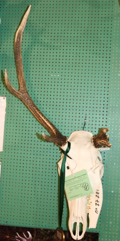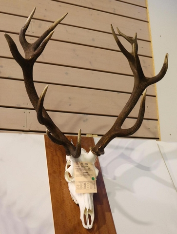 Ce jeune cerf âgé de deux ans a été prélevé dans le massif du Sanon, au cours de la saison de chasse 2024-2025. Il présente un trophée particulièrement singulier, marqué par une forte dissymétrie entre les deux bois. Le bois de droite affiche en effet une structure tout à fait normale pour un animal de cet âge, avec six cors bien formés et une croissance régulière, témoignant d’un développement normal. En revanche, le bois de gauche se réduit à une sorte de moignon, très court et incomplet, évoquant un arrêt de croissance précoce. Cette anomalie confère à l’ensemble un caractère rare et peu commun, probablement lié à un traumatisme ancien, faisant de ce trophée un exemple atypique particulièrement intéressant à observer.