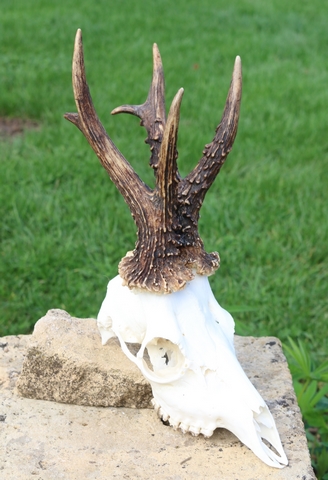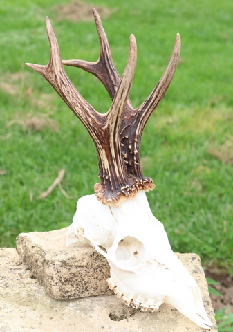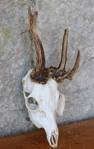 Un profil de six pointes à droite se distingue nettement, avec une mini-fourche sommitale bien marquée, accompagnée d’un andouiller antérieur très court, implanté juste au-dessus de la meule. Cette configuration donne à ce côté une allure compacte mais équilibrée. À gauche, la morphologie est tout autre : une sorte de plateau massif semble se confondre avec la meule, formant une base élargie et atypique, d’où émergent une perche principale et deux andouillers nettement courbés. L’ensemble présente une asymétrie frappante, renforçant le caractère singulier de ce trophée. Voilà donc un brocard pour le moins original, tant par la structure que par l’expression. Il a été prélevé lors de la saison de chasse 2024/2025, et ne manquera pas d’attirer l’attention des passionnés.