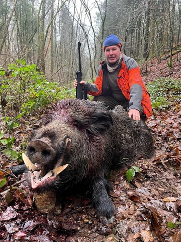 Estimé à 6 ans, ce solitaire au profil de grand vieux sanglier, a été tiré par Pascal Paquit, dans un bois privé de la commune de Givonne, en périphérie de la ville de Sedan. La beauté de l’animal a conduit les responsables de ce petit groupe de chasseurs, à l’offrir en entier à la Fédération, laquelle cherchait depuis un certain temps « le » beau sanglier, symbole du département, à naturaliser entièrement, pour les besoins de la Maison de la chasse et de la Nature. Ce qui fut réalisé en 2025. Le trophée, qui a été remis au tireur, atteint la cotation de 108,60 points, ce qui n’est pas exceptionnel malgré l’âge de l’animal. Les défenses mesurent 17 cm et 21,8 cm de longueur, et 25,7 et 24,3 mm de largeur. Quant à la circonférence des grès, elle est de 6,6 cm à gauche comme à droite.