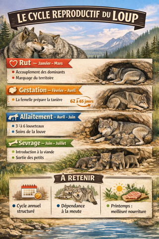 Chaque printemps marque une étape clé dans le cycle de vie du loup gris : la période des naissances. Après une gestation d’environ 62 à 65 jours, les femelles dominantes donnent naissance à une portée comptant généralement entre 3 et 6 louveteaux, même si ce nombre peut varier selon les conditions environnementales et la disponibilité alimentaire. Les petits naissent aveugles et totalement dépendants de leur mère, qui reste plusieurs semaines à proximité de la tanière pour les protéger et les allaiter. Durant cette phase, la louve adopte un comportement particulièrement vigilant et territorial. Les autres membres de la meute participent à l’alimentation de la mère et, plus tard, des jeunes, en régurgitant de la nourriture.