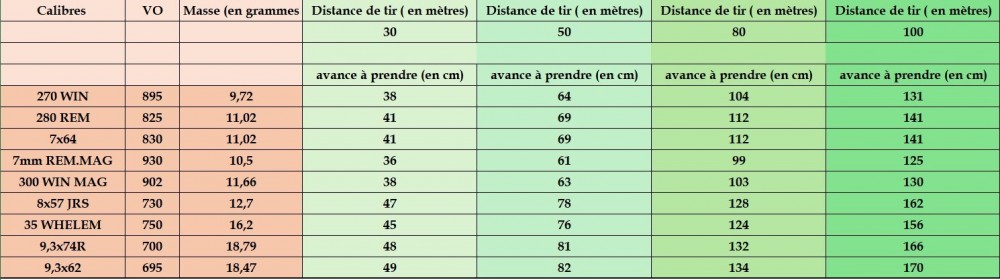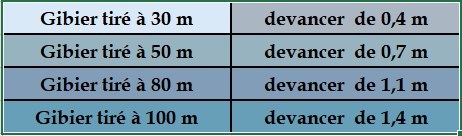 A la lecture de ce tableau, on peut tirer une synthèse applicable à tous les calibres trouvés en battue, sur un gibier fuyant au galop, en plein travers, avec une munition offrant une vitesse initiale de 800 m/s pour une masse de 13 grammes. On appliquera alors les corrections suivantes, toujours dans le mouvement :