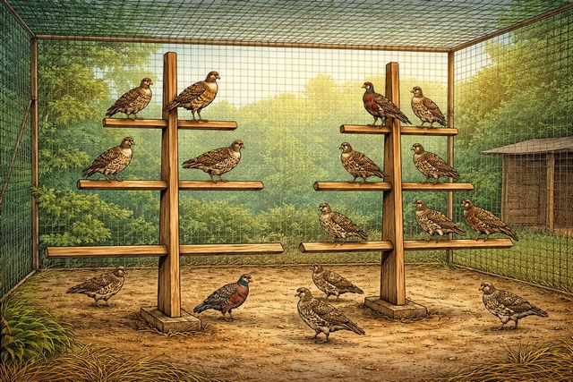 Le dispositif est relativement facile à réaliser. Il s’agit d’installer, dans une petite volière d’environ 3 mètres sur 3, des perchoirs en forme de « sapin ». Chaque structure est constituée d’un axe vertical auquel sont fixés trois tasseaux horizontaux. Le premier est placé à environ 20 centimètres du sol, le second à 50 centimètres et le troisième à 80 centimètres. Cette disposition permet aux faisandeaux de monter progressivement, en fonction de leur aisance et de leur équilibre. Une quinzaine de jeunes oiseaux au mètre carré sont installés dans cet espace.