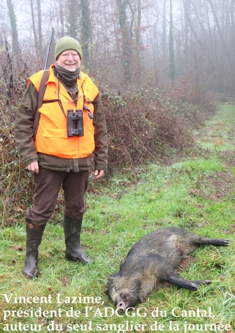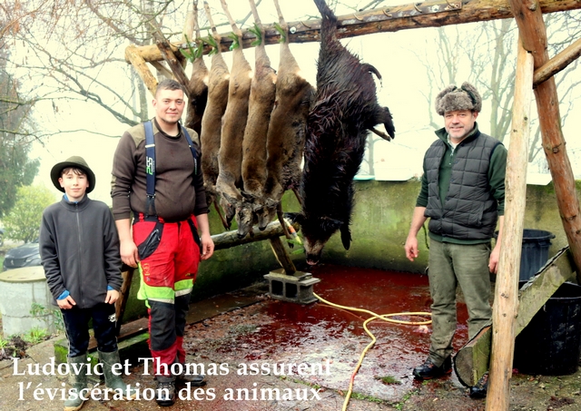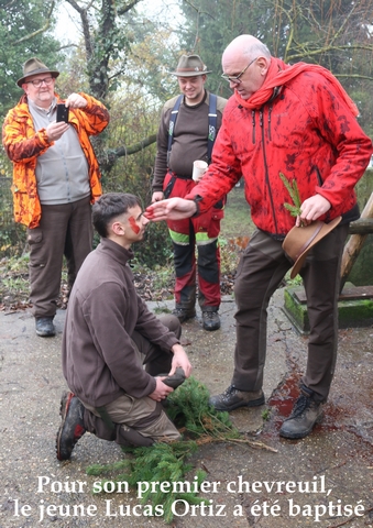 Emmené par Bruno, je suis posté sur un mirador d’affût dominant une prairie encadrée de deux bandes boisées, où les coulées sont nombreuses. La montée se fait avec prudence, les barreaux étant particulièrement glissants. Je m’installe pour plus de trois heures d’affût. À 9 h 40, une silhouette de chevreuil apparaît dans le brouillard, sans possibilité d’identification ni de photographie. À 10 h, un coup de carabine retentit, puis un autre vers 11 h. Les traqueurs se rapprochent. Un nouveau tir, puis un second dix minutes plus tard, au même poste. Fritz, traqueur, m’apprend ensuite qu’un sanglier a été prélevé et qu’un renard a été manqué. À 12 h 30, je quitte mon poste. Au rendez-vous de chasse, le garde Ludovic, aidé de son entourage, s’affaire déjà au traitement des carcasses. Le tableau final compte un sanglier et cinq chevreuils, dont une chevrette à pivots, pour 11 balles tirées. Les observations font état de 12 chevreuils, un lièvre et 24 sangliers vus. Les brisées sont remises, avant le baptême de Lucas Ortiz, jeune chasseur ayant prélevé son premier chevreuil. La matinée se conclut, dans une ambiance chaleureuse et typiquement alsacienne, autour d’un pot-au-feu de cerf, malgré un brouillard qui persistera jusqu’au lendemain.