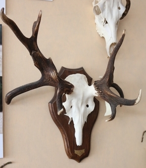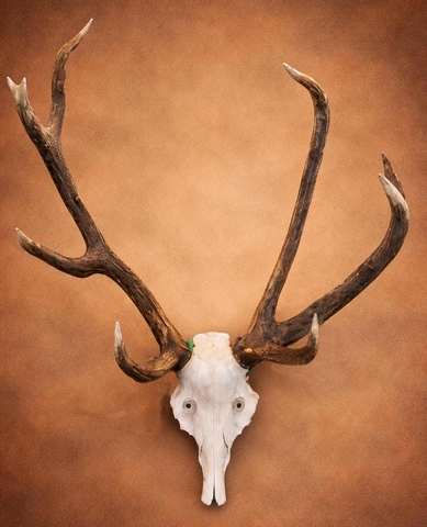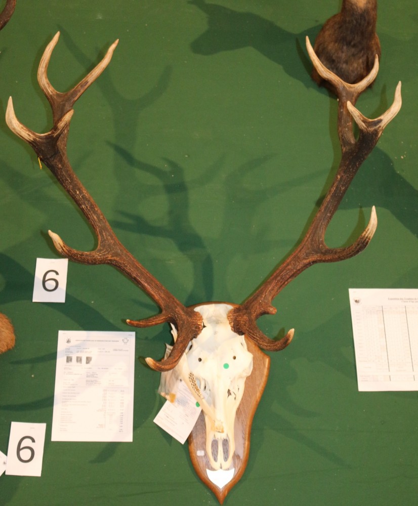 Présenté à l’exposition de Châteauroux 2024, ce cerf remarquable est estimé à plus de dix ans. Il se distingue par une anomalie morphologique peu fréquente : un dédoublement du merrain gauche prenant naissance juste au-dessus de l’andouiller d’œil. Cette particularité donne lieu à deux perches bien individualisées. La première porte une fourche sommitale classique, tandis que la seconde, presque aussi longue, se termine par une pointe sommitale nettement courbée, conférant à l’ensemble une silhouette atypique et spectaculaire. Le bois droit, plus conforme aux standards, présente une configuration de dix cors, avec toutefois une fourche antérieure très courte, signe possible d’un ralentissement de croissance lié à l’âge. L’ensemble du trophée traduit le vécu d’un animal âgé, chez lequel l’usure physiologique et les perturbations de croissance s’expriment pleinement. Une tête singulière, emblématique de la variabilité naturelle observée chez les grands cervidés matures.