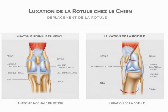 La luxation médiale est la plus fréquente, mais la forme latérale s’observe davantage chez les races de grande taille et sportives. Chez un chien d’arrêt ou courant, les contraintes biomécaniques répétées (accélérations, sauts, pivots) peuvent révéler une instabilité sous-jacente. Le tableau varie : boiterie intermittente avec « saut de cabri », port du membre fléchi, intolérance à l’effort, baisse de performance. Certains chiens de chasse compensent longtemps, masquant la douleur jusqu’à l’apparition d’arthrose secondaire. La palpation met en évidence une rotule luxable manuellement, classée en quatre grades (I à IV) selon la facilité de luxation et la permanence du déplacement.