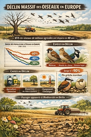 Depuis plusieurs décennies, les populations d’oiseaux connaissent en Europe un déclin alarmant. Les suivis scientifiques engagés depuis les années 1980 dressent un constat sans appel : la baisse est généralisée et touche désormais la quasi-totalité des milieux. Les espèces des zones agricoles sont les plus durement frappées, avec une chute d’environ 60 % en quarante ans.