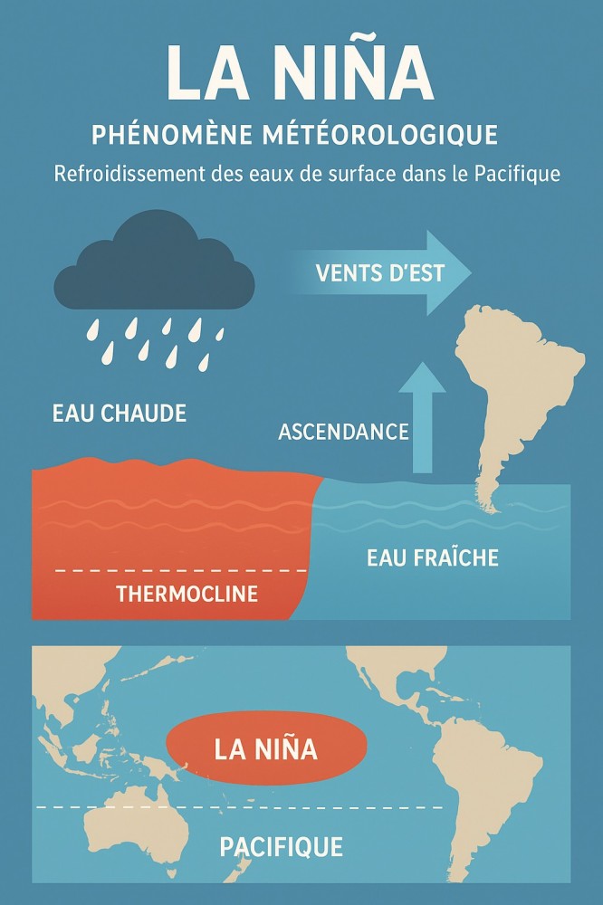 Le phénomène climatique La Niña, caractérisé par un refroidissement des eaux du Pacifique équatorial, refait surface en 2025 avec des implications potentielles pour la France. Bien que son intensité soit modérée, ses effets pourraient se faire sentir, notamment en raison du contexte de réchauffement climatique global, selon les prévisions de l'Organisation Météorologique Mondiale (OMM). En France, les régions de l’Ouest et du Sud pourraient être particulièrement affectées, entraînant des périodes prolongées de temps sec. Ce phénomène, couplé à un réchauffement climatique déjà en cours, pourrait accentuer les risques de sécheresse, affectant l'agriculture et les ressources en eau. Dans l'Est de la France, les conditions pourraient être plus variables. Des fluctuations de température, parfois intenses, pourraient survenir, avec des épisodes de chaleur suivis de refroidissements soudains. Les régions montagneuses, telles que les Alpes, pourraient connaître des épisodes de neige imprévisibles, tandis que les plaines pourraient voir des vagues de chaleur plus marquées. Bien que La Niña ait des effets plus prononcés dans les régions tropicales, les zones côtières de l'Atlantique, notamment les îles françaises comme la Guadeloupe, la Martinique ou la Réunion, pourraient être exposées à un risque accru de cyclones tropicaux. Bien que La Niña soit un phénomène cyclique, ses impacts sur la météo mondiale, y compris en France, sont de plus en plus surveillés. Les spécialistes, prudents, concluent : « la France devra donc se préparer à un hiver plus sec, avec des épisodes de températures plus douces et un risque accru de sécheresse, notamment dans les régions de l’Ouest et du Sud... ». Pour vérifier tout cela, il ne reste plus qu’à attendre le printemps !