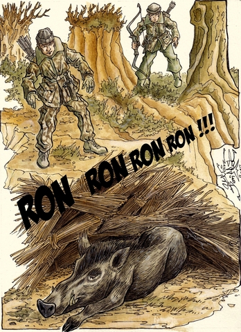 et le plus prolifique en matière de chasse aux sangliers, on tente de refaire le monde chaque fois que possible. C’est ici que le premier plan de chasse sanglier a été porté sur les fonds baptismaux, aux forceps il est vrai, et quand on voit ce qu’il est devenu, une sourde angoisse vous serre la gorge et vous donne envie de laisser rouler de grosses larmes. Dans un silence complice, inspiré peut être par nos voisins hollandais grands spécialistes des massacres d’oies, on asphyxie, on empoisonne et on massacre en masse. A l’image des tontons flingueurs, « on éparpille, on flingue, on dynamite, on disperse, on ventile… ». Pays du double langage, ceux là même qui prônent la quasi-éradication de ce magnifique animal qu’est Sus scrofa, au prétexte des dégâts qu’il commet, appliquent sur leur propre territoire une protection forcenée et douteuse, à force d’amendes dignes des plus riches émirats. C’est dans cette ambiance décontractée et surréaliste, qui mettrait tous les syndicalistes dans la rue, qu’une équipe de chasseurs à l’arc prend son plaisir sur un petit territoire. Immédiatement suspectée, compte tenu de ses étranges pratiques, elle a été, comme on peut l’imaginer ici, l’une des premières victimes de battues administratives punitives, organisées pour faire baisser la pression avec le monde agricole. Immolé sur l’hôtel de la médiocrité, un seul sanglier, le seul vu, a été le martyr expiatoire de ce procès en sorcellerie...