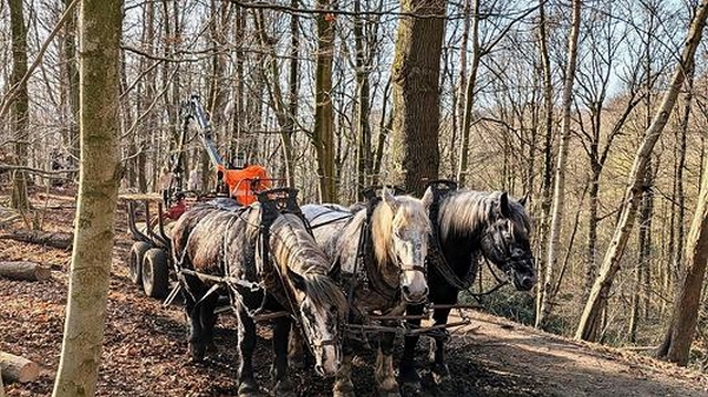 - Nord : une opération de débardage à cheval a été menée fin février dans le massif du Mont Noir, dans les Flandres, afin d’extraire du bois récemment coupé tout en préservant ce milieu naturel sensible. L’intervention était organisée par l’ONF et le département du Nord, propriétaire du site, très fréquenté par le public. La topographie escarpée et l’absence de routes forestières rendaient l’utilisation d’engins mécaniques difficile et potentiellement dommageable pour les sols. Le choix s’est donc porté sur le débardage à cheval, une méthode traditionnelle permettant de travailler dans des zones difficiles d’accès tout en limitant l’impact sur la végétation et les terrains. Durant quatre jours, sept chevaux de trait (percherons, comtois, bretons et traits du Nord) ont transporté les grumes sur un terrain pentu et boueux. L’opération concernait principalement des châtaigniers, essence dominante du secteur.